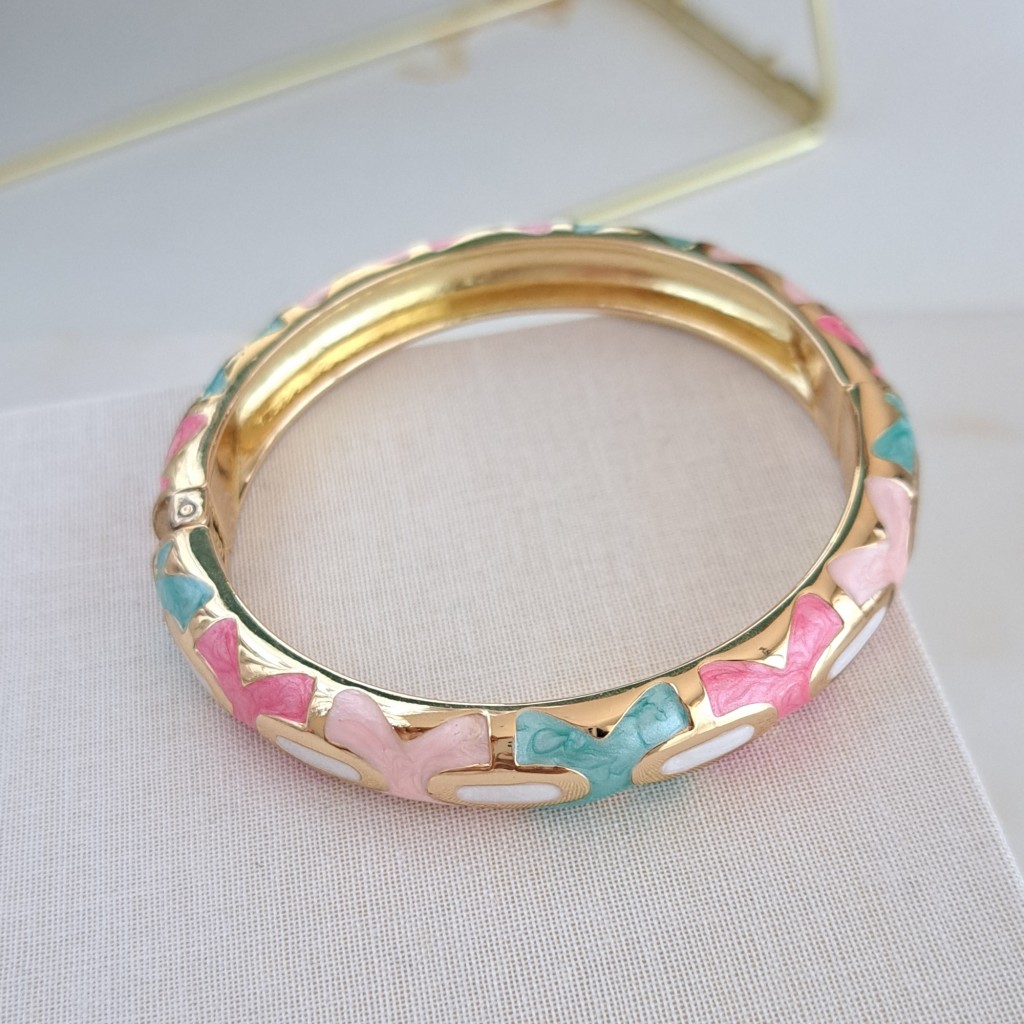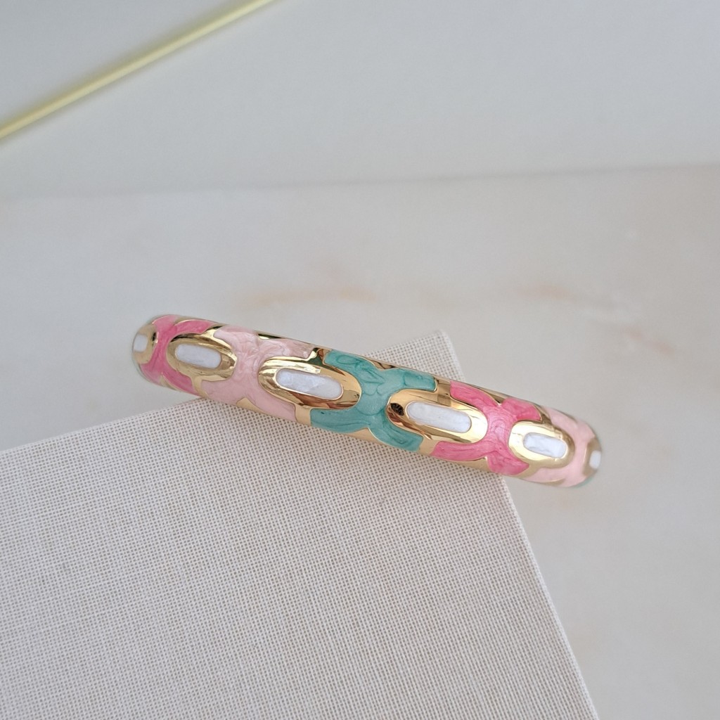 این دستبند میناکاری با طراحی فنری، انتخابی شیک و خاص برای علاقهمندان به زیورآلات هنری و سنتی است. ترکیب رنگهای سفید، صورتی و آبی صدفی در کنار جزئیات مینایی، ظاهری لطیف و متفاوت به آن بخشیده است.