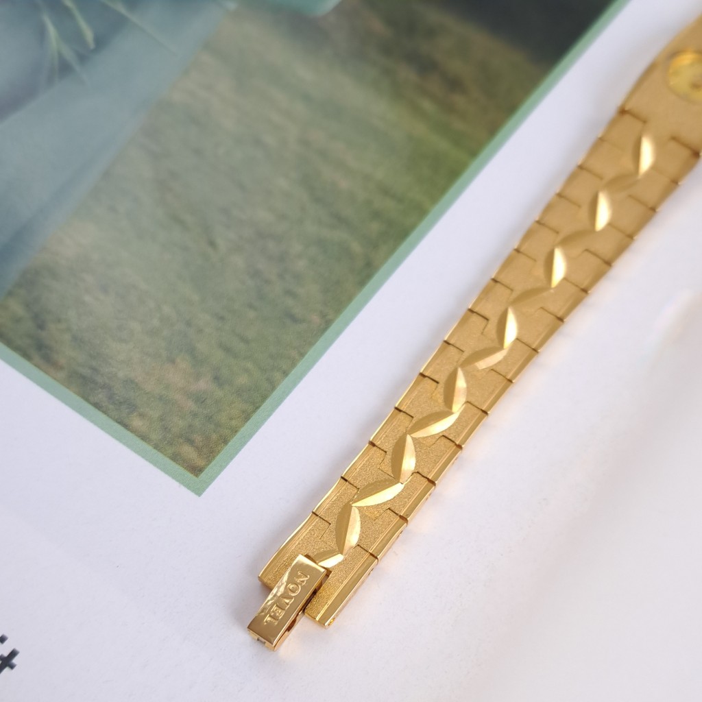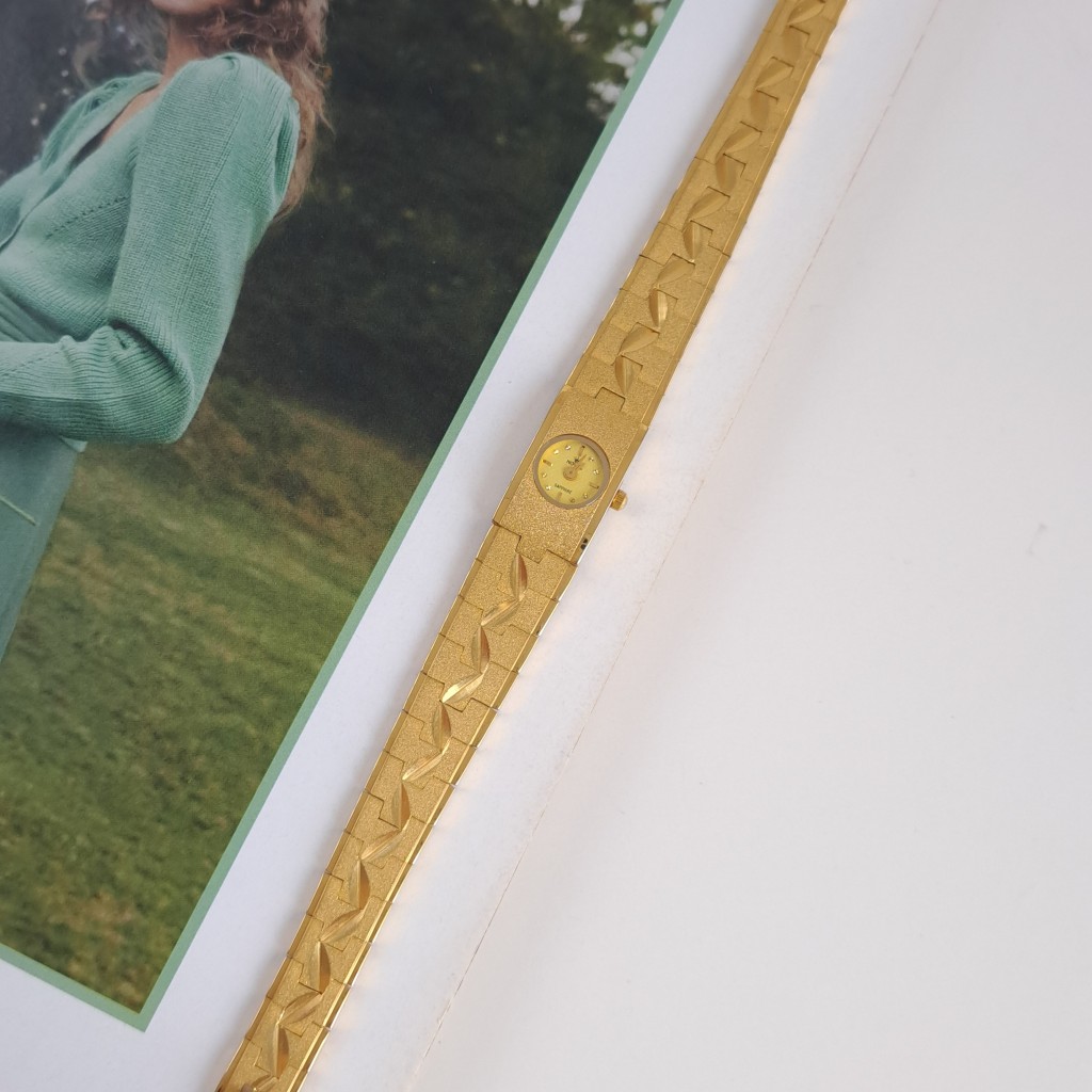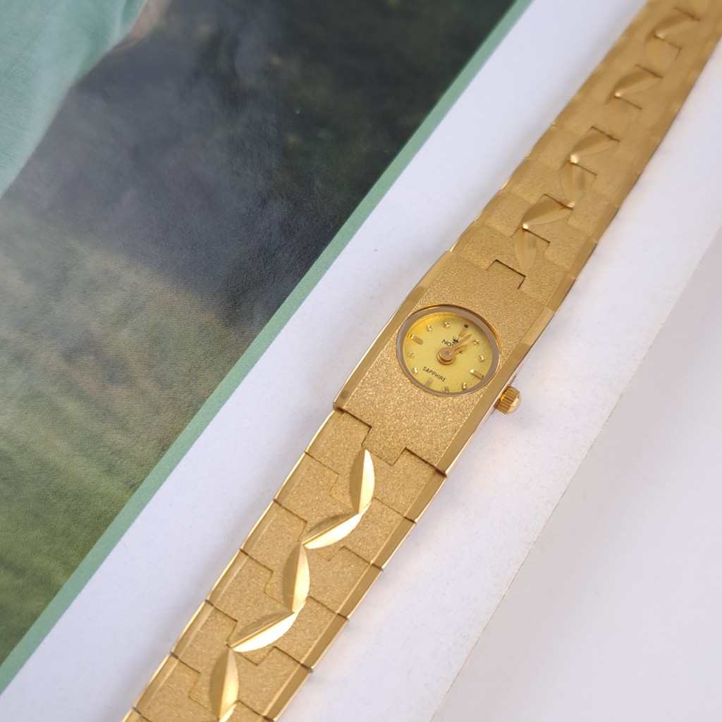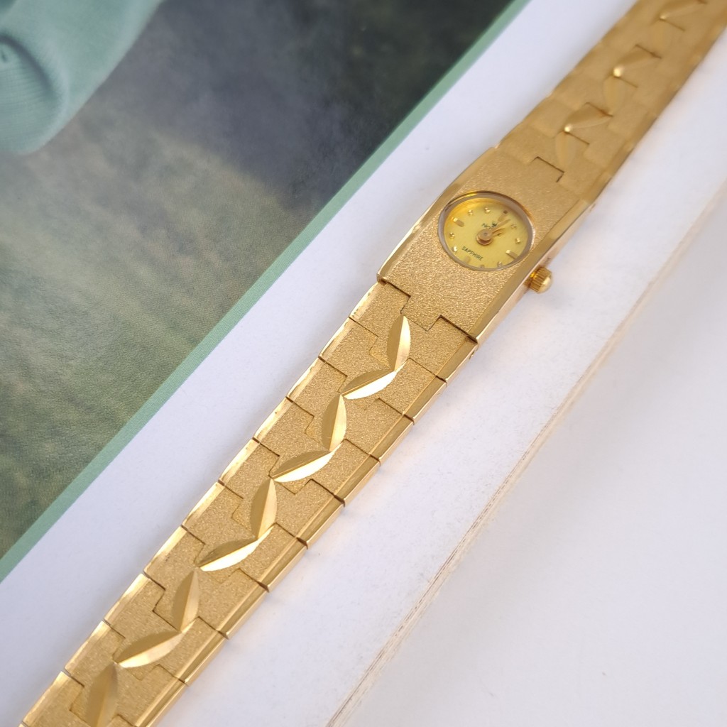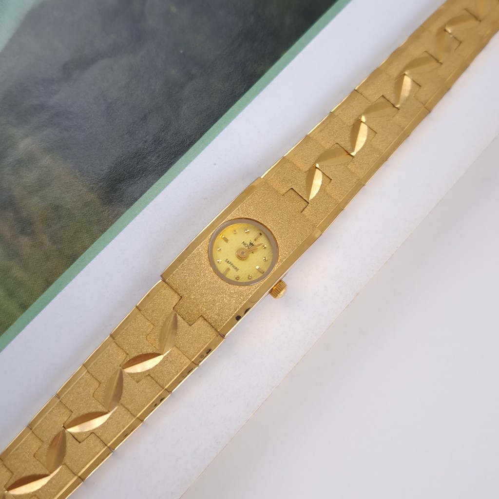 بند این ساعت از جنس استیل مقاوم با روکش طلا ساخته شده و به دلیل ساختار پیندار، بهراحتی قابل تنظیم و کوتاه کردن است. طراحی پروانهای بندها حالوهوایی خاص و زنانه به آن بخشیده و در کنار درخشش طلایی، جلوهای از ظرافت، وقار و شکوه ایجاد میکند.