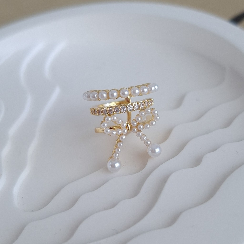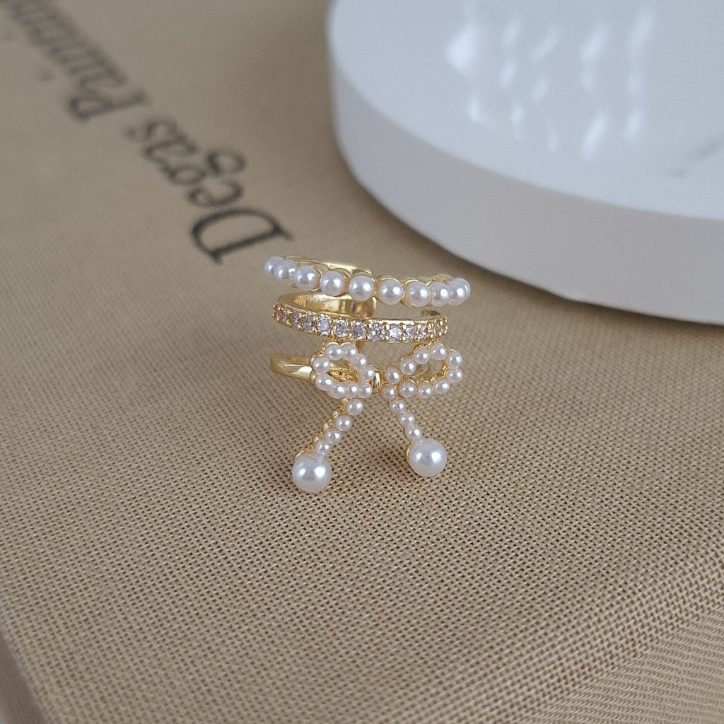 گوشواره ایرکاف پاپیون سه لاین مرواریدی با طراحی فشن و نمادین. بدون نیاز به سوراخ گوش، مناسب استایلهای لایهای و مدرن.