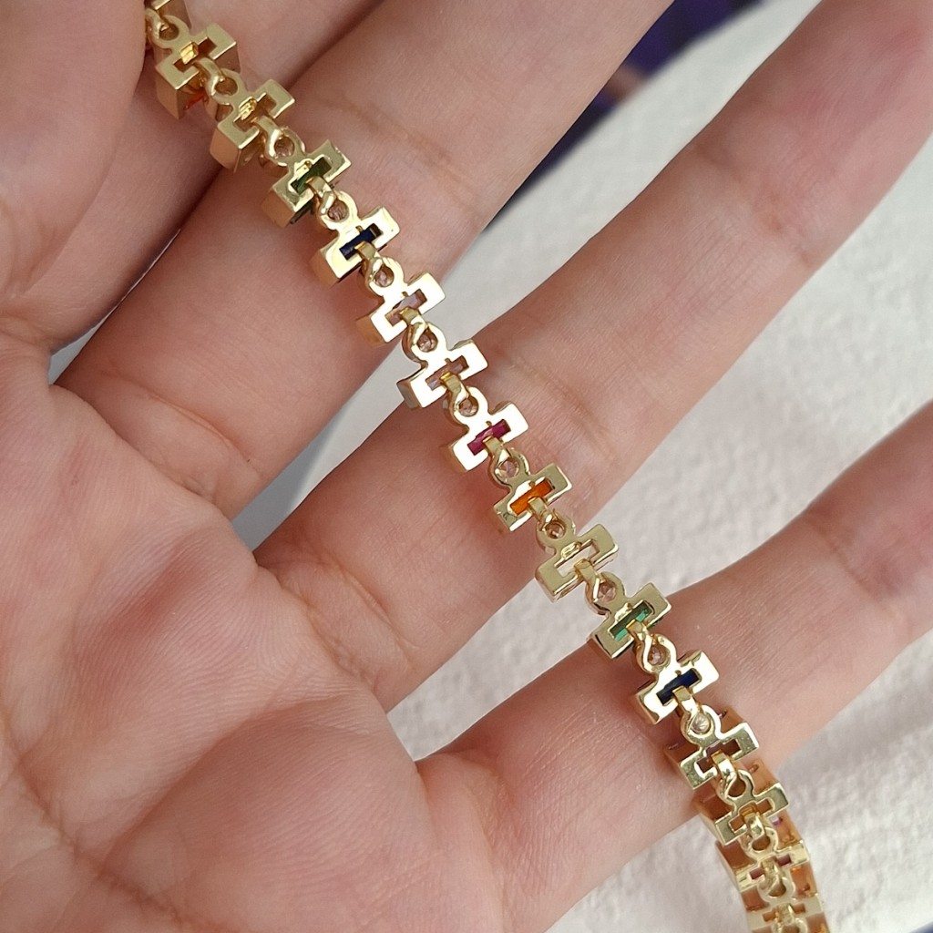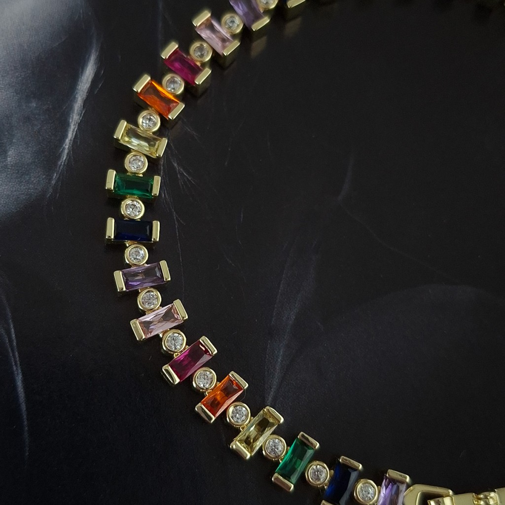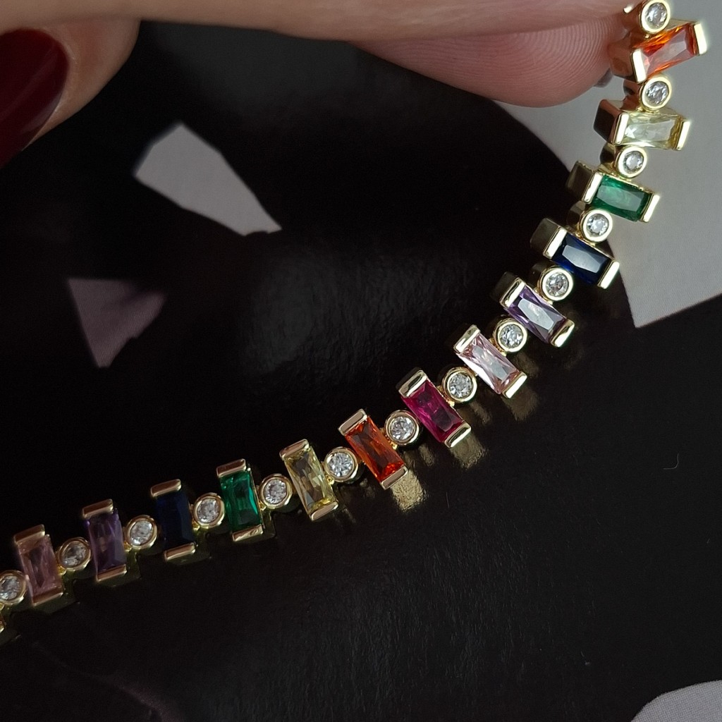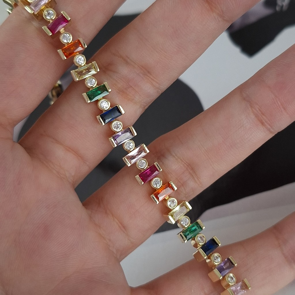 دستبند باگت رنگی با طراحی هندسی و رنگهای متنوع؛ مناسب استایلهای فشن، مینیمال و مدرن. جلوهای چشمگیر و برجسته روی مچ.