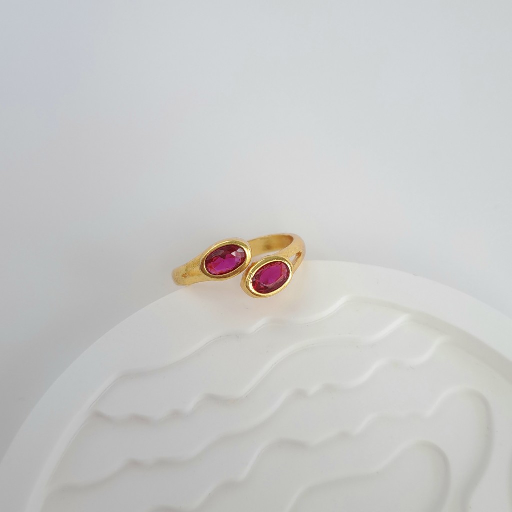 - در بخش مرکزی، دو نگین بزرگ و بیضی شکل با رنگ صورتی پررنگ (شبیه به یاقوت سرخ یا روبی) کار شده است. این نگینها به دلیل رنگ جذاب و درخشش خوب، مرکز توجه انگشتر هستند و زیبایی آن را دوچندان میکنند.