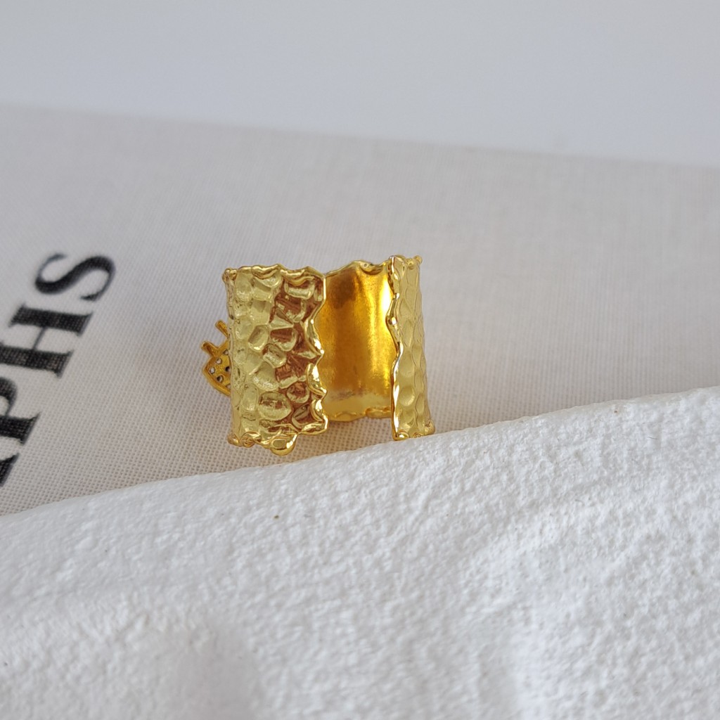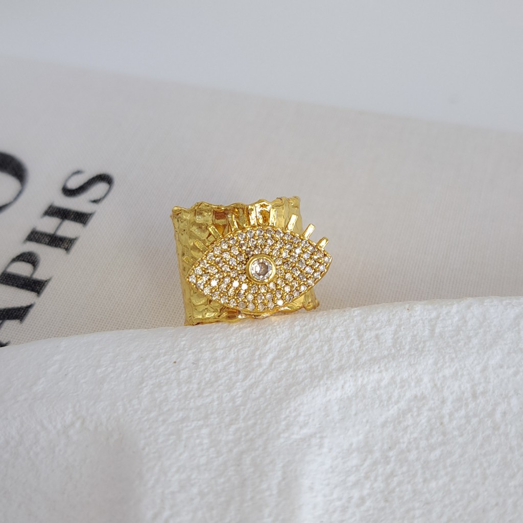 رنگ طلایی نماد ثروت، موفقیت و انرژی مثبت است و هنگامی که در مرکز طرح چشم قرار میگیرد، جلوهای قدرتمند و درخشان ایجاد میکند. طراحی مژهدار این انگشتر نیز حالتی زنانه، هنری و ظریف به آن اضافه کرده است. فرم پهن و برجسته انگشتر باعث میشود که بهسرعت در استایل شما جلب توجه کند و به یک نقطه کانونی جذاب تبدیل شود.