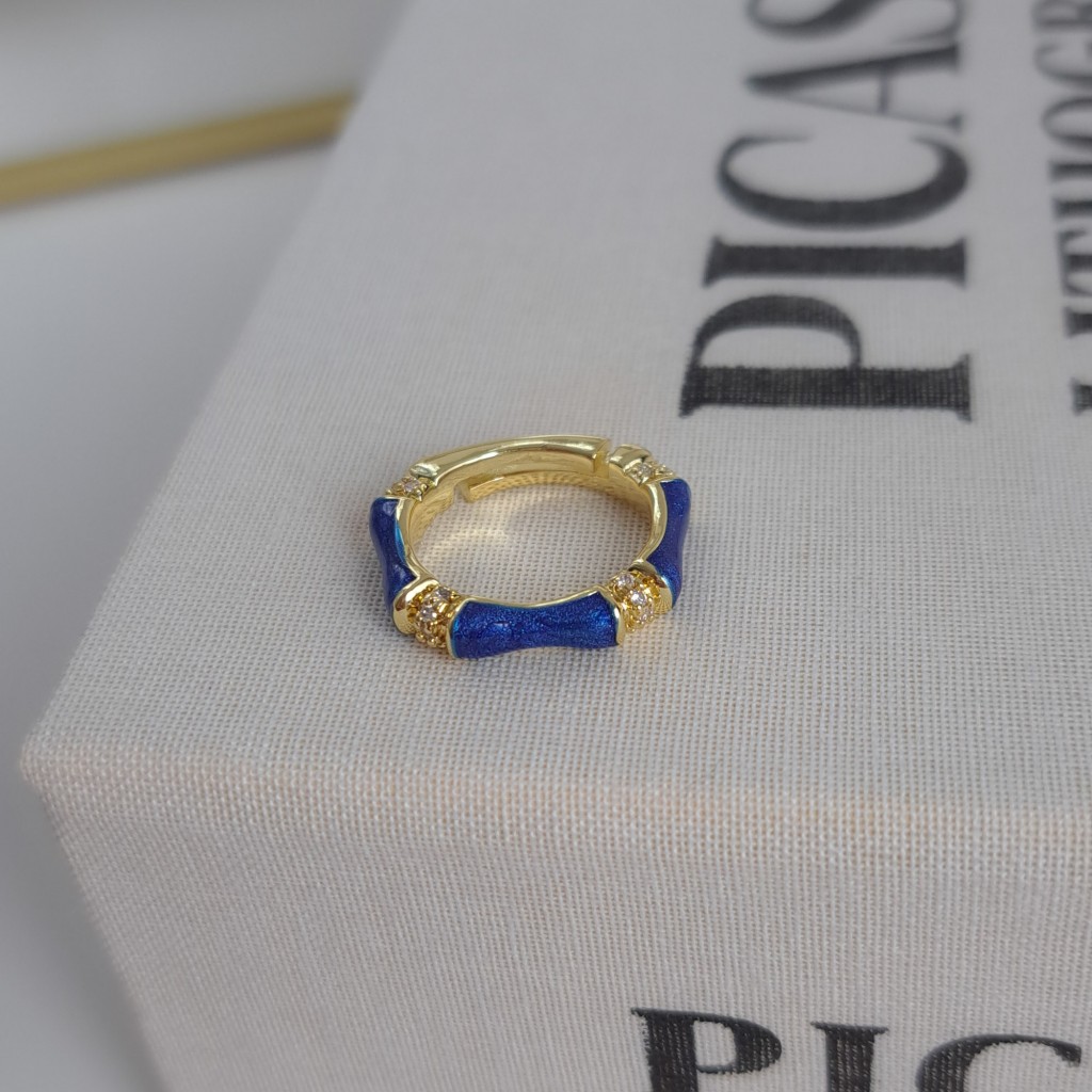 رنگ آبی در این انگشتر نمادی از آرامش و جذابیت است و در ترکیب با میناکاری درخشان و شاینهای ریز، درخششی چشمگیر ایجاد میکند. این ترکیب رنگی بهگونهای طراحی شده که هم در استایلهای روزمره و ساده جلوه داشته باشد و هم در مهمانیها و مجالس رسمی بدرخشد.