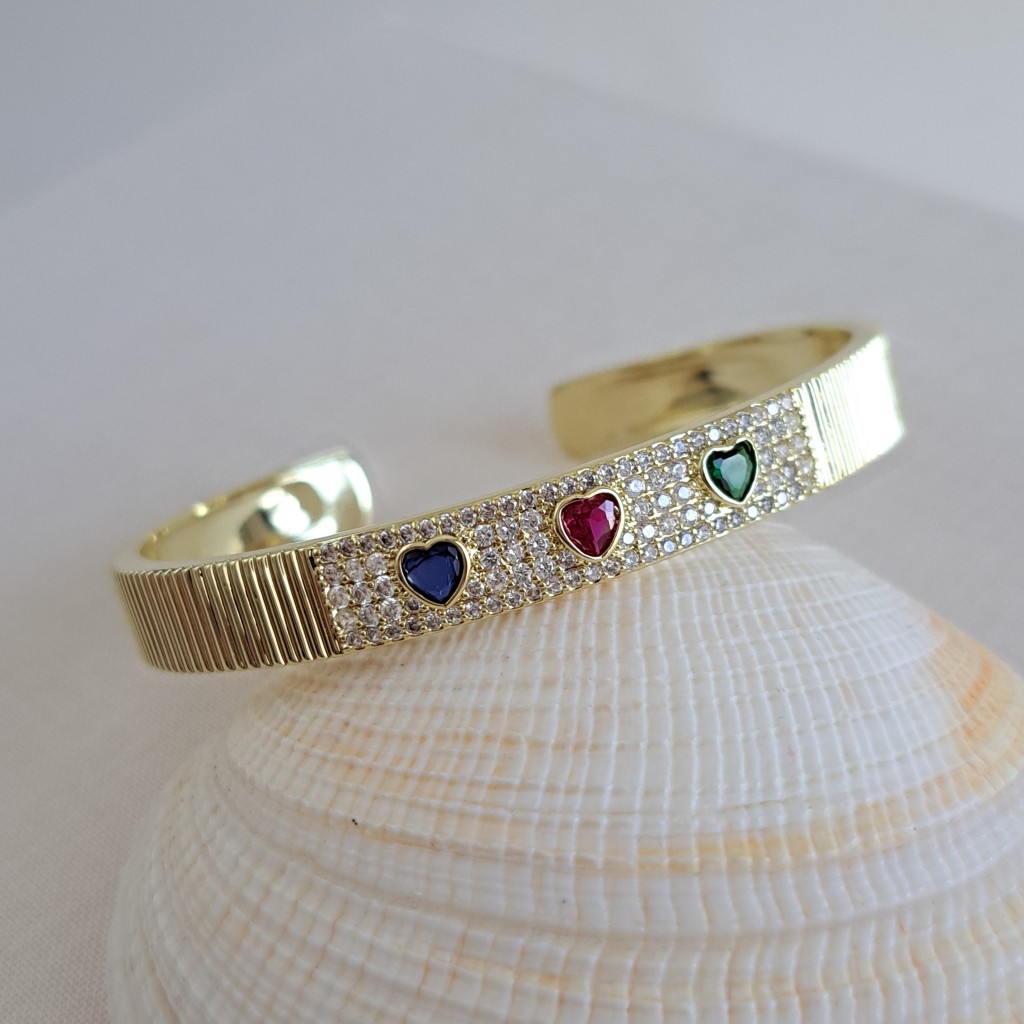 یکی از زیباترین و پرطرفدارترین اکسسوریهای Nilay Jewelry است که ترکیبی از ظرافت زنانه و طراحی مدرن را در قالبی طلایی و درخشان ارائه میدهد. این بنگل با طراحی سه قلب نگیندار در مرکز خود، حس عشق، ظرافت و درخشش را در یک قطعه زیورآلات جمع کرده است.