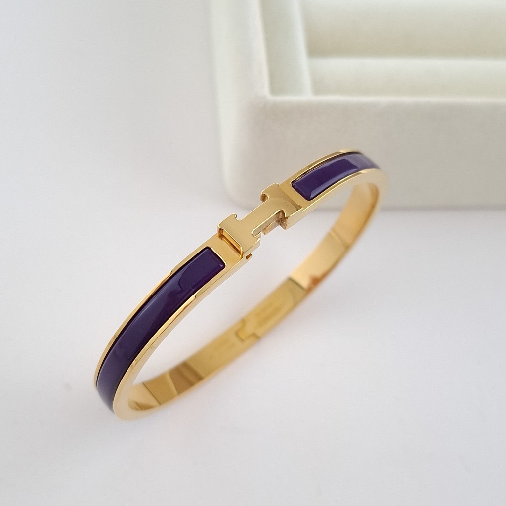 دستبند لوکس طرح برند هرمس با قفل نمادین H و رنگ طوسی بنفش. کیفیت نیم میل، طلایی، اکسسوری فشن و کلاسیک.
