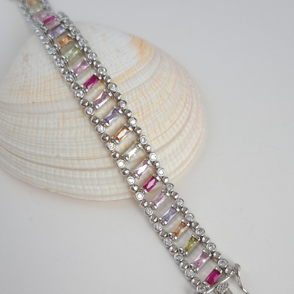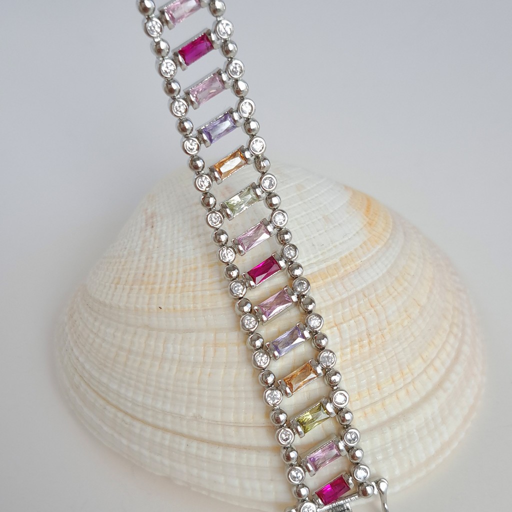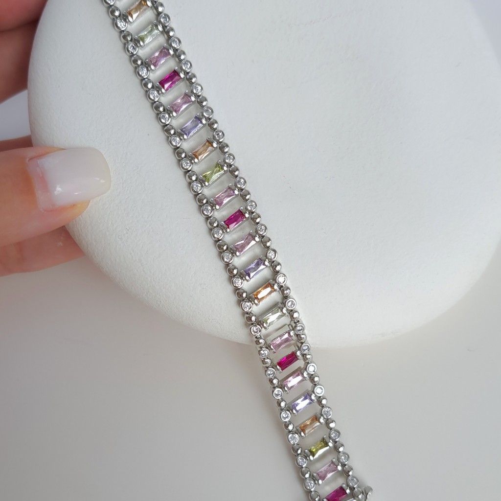 این دستبند طرح طلای نقرهای باگت رنگی ترکیبی از رنگ، درخشش و ظرافت است که استایل شما را کامل میکند. طراحی مدرن و نگینهای باگت باعث میشوند این دستبند برای انواع استایل مناسب باشد و جلوهای خاص و چشمگیر به مچ دستتان ببخشد. یک انتخاب عالی برای خودتان یا هدیهای خاص برای عزیزانتان
