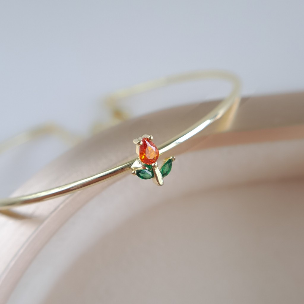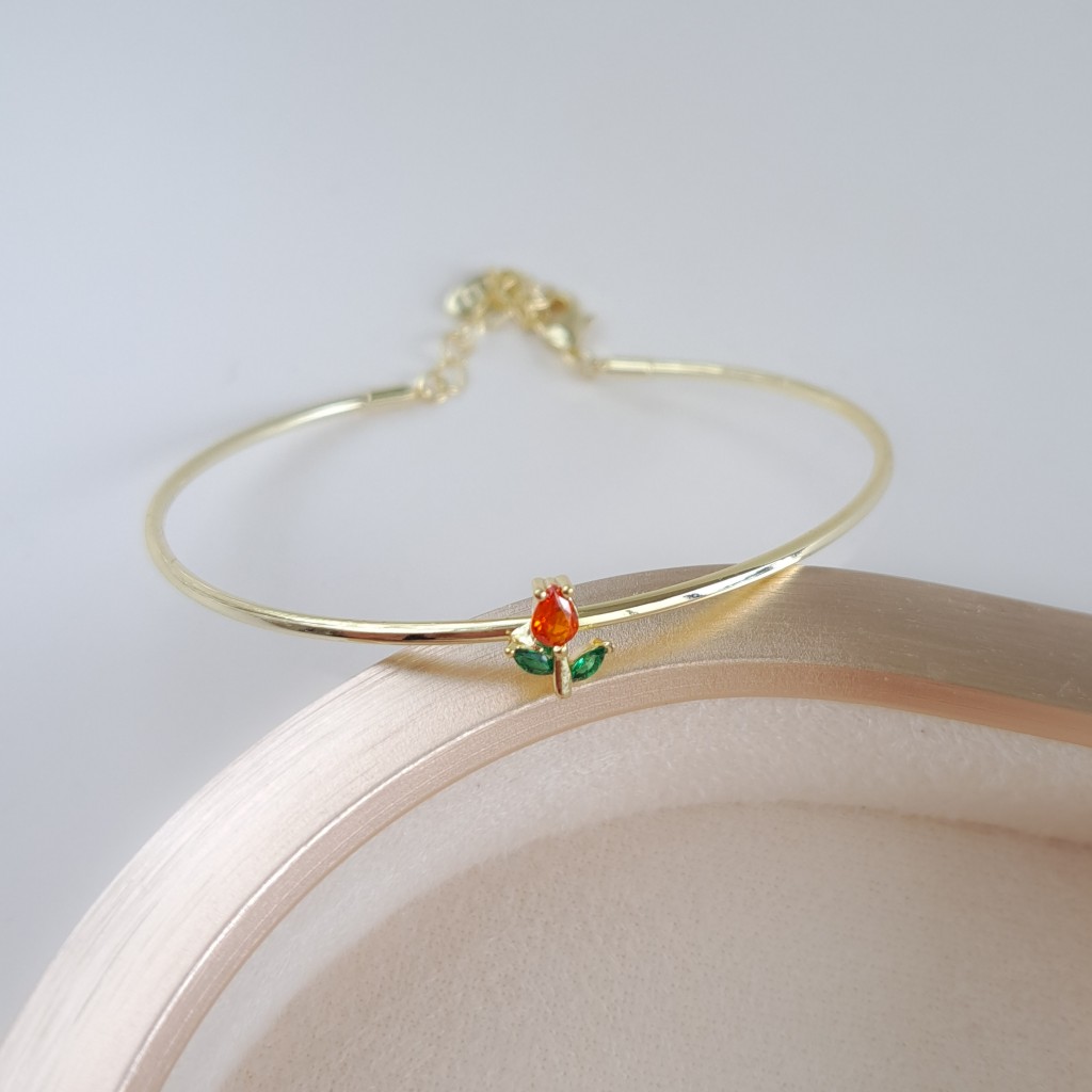 رنگ نارنجی همیشه در دنیای مد و زیورآلات جایگاه ویژهای داشته است؛ رنگی که نشانهی جسارت، اعتمادبهنفس و جذابیت درونی است. در طراحی این دستبند، فرم گل با دقت و ظرافت کار شده تا جلوهای طبیعی و زنده داشته باشد. ترکیب طرح گل با ساختار بنگل، هماهنگی خیرهکنندهای ایجاد کرده که هم برای استفاده روزمره و هم برای موقعیتهای خاص مناسب است.