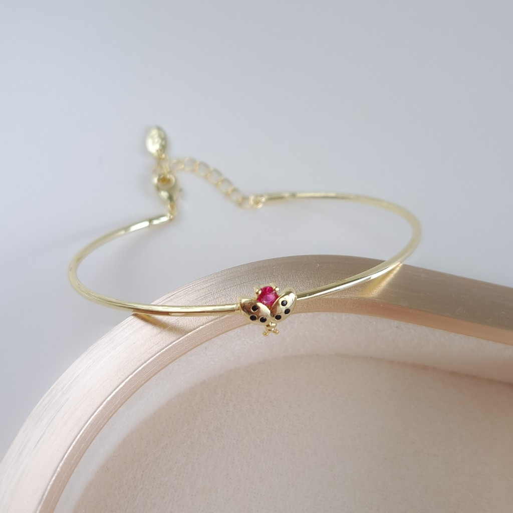 جزئیات کفشدوزک با رنگهای قرمز و مشکی لعابکاری شدهاند تا جلوهای فانتزی و خاص داشته باشند. این ترکیب رنگ در کنار فلز براق، دستبند را به اکسسوریای جذاب برای استفادهی روزمره، استایلهای اسپرت یا حتی مهمانیهای غیررسمی تبدیل کرده است.