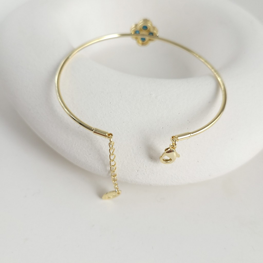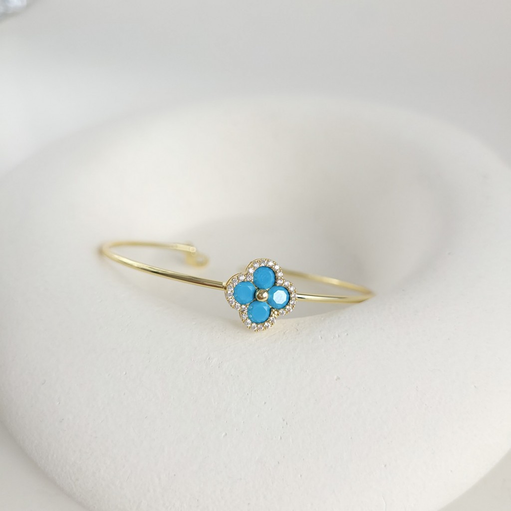 دستبند بنگل ظریف ونکلیف با گل چهارپر آبی