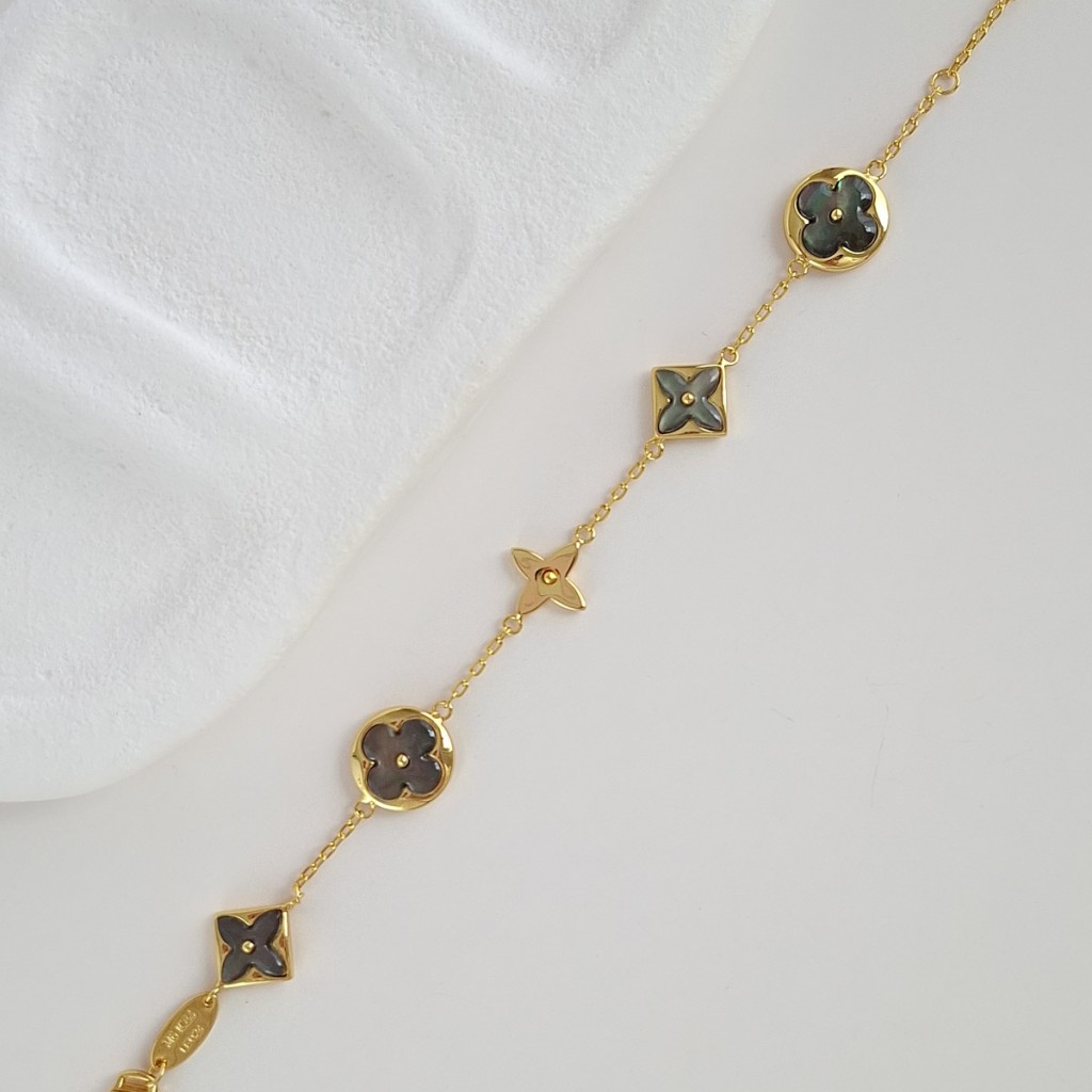 ساختار اصلی این دستبند از یک زنجیر محکم با رنگ طلایی ثابت تشکیل شده که با پلاکهای کوچک و بزرگ به شکل گل چهار پر (طرح معروف LV) تزئین شده است. این طراحی یک مدل شیک و پرطرفدار ایجاد میکند: