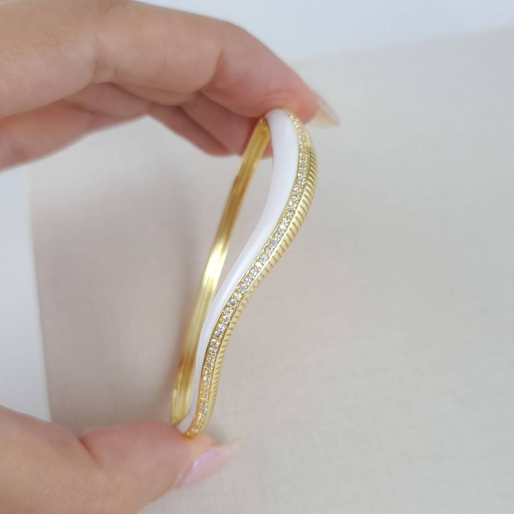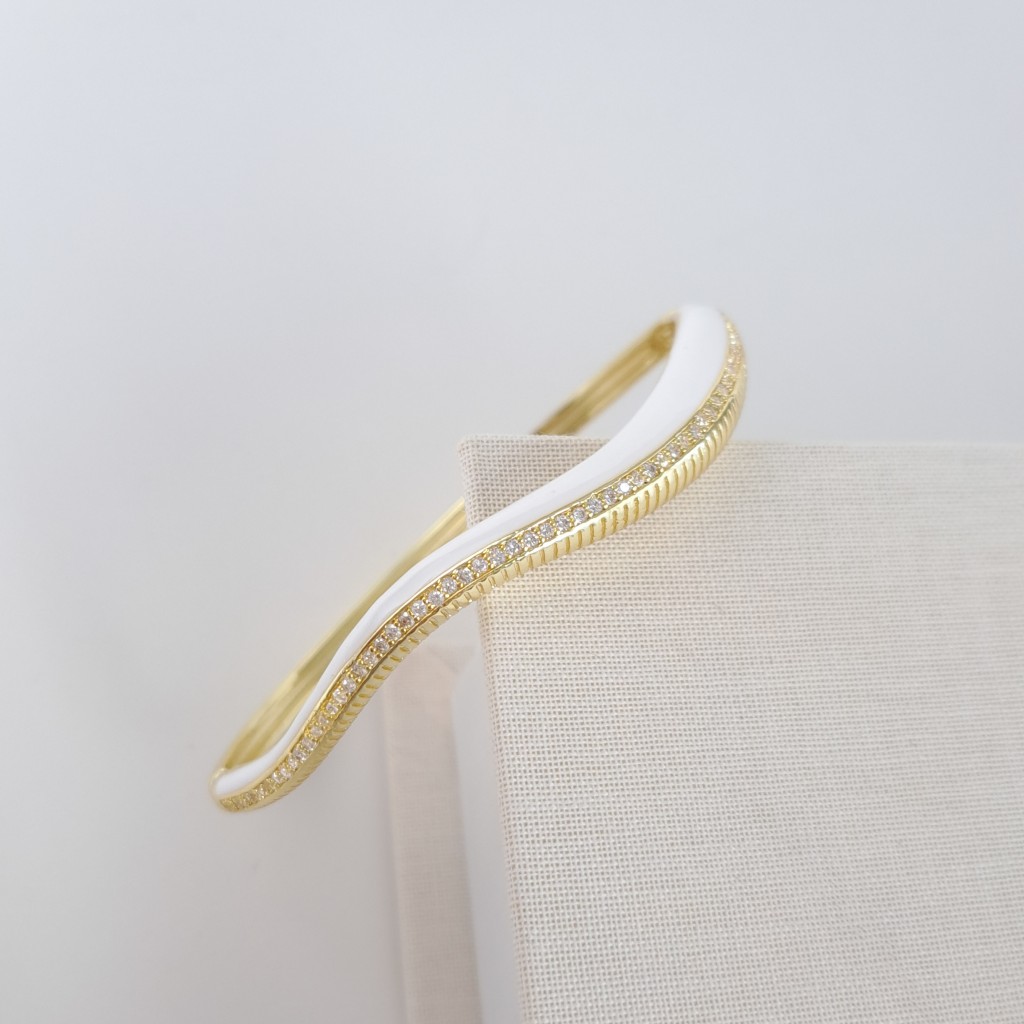 این دستبند مناسب کسانی است که به دنبال اکسسوریای شیک، لوکس و مدرن هستند. دستبند موج طرح طلا میناکاری سفید، ترکیبی از طراحی هنری، رنگ کلاسیک و جلوه لوکس است که استایل را ارتقا داده و شخصیت و ظرافت را همزمان نمایش میدهد.