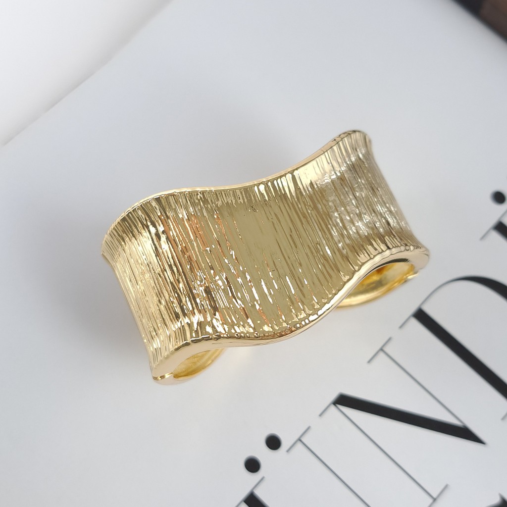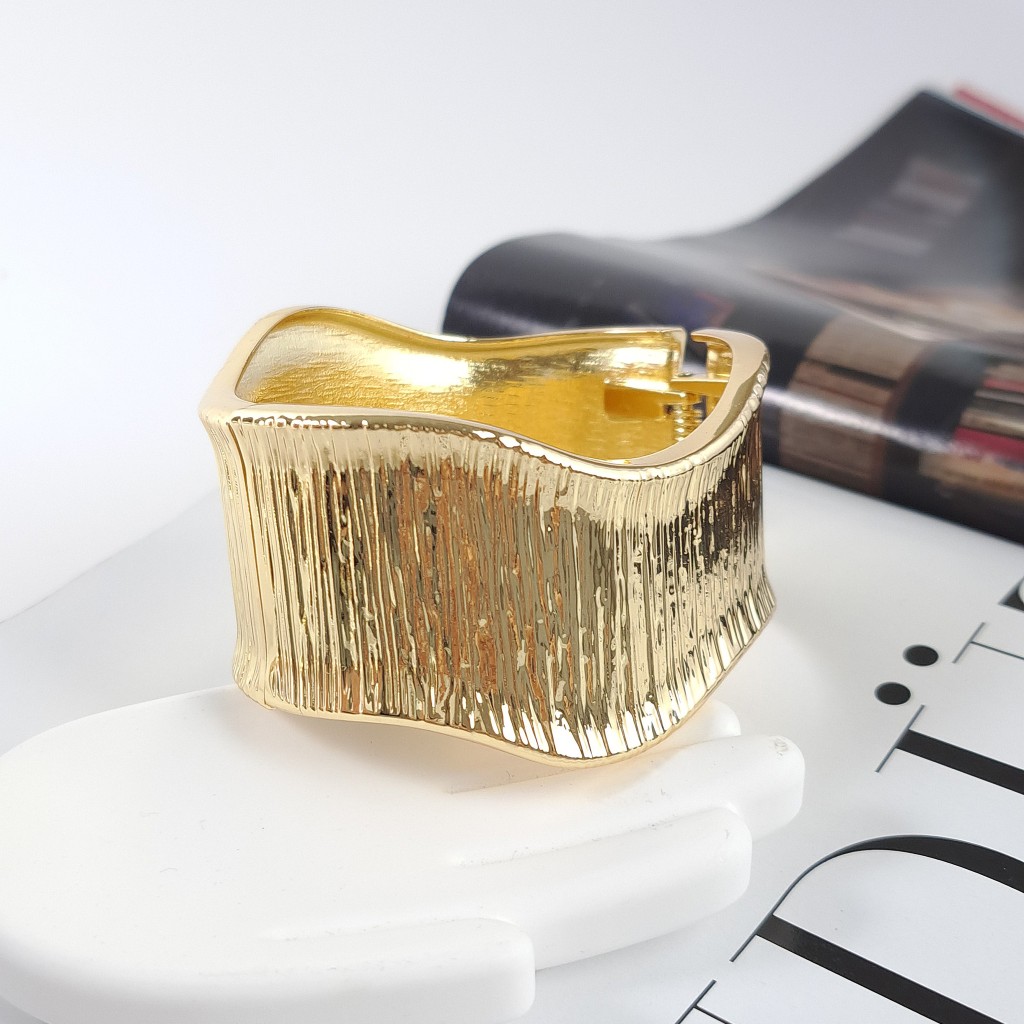 یکی از مدلهای برجسته و مدرن زیورآلات است که با الهام از طراحیهای موجدار و مینیمال، جلوهای شیک، جذاب و مدرن به استایل شما میبخشد. فرم پهن و موجدار این دستبند، ترکیبی از هندسه نرم و خطوط روان ایجاد کرده است که نه تنها زیبایی بصری دارد، بلکه حرکت دست را نیز جذابتر نشان میدهد. روکش طلایی براق و خوشرنگ، جلوهای مشابه طلای واقعی به این اکسسوری میدهد و در نور انعکاس زیبایی ایجاد میکند.