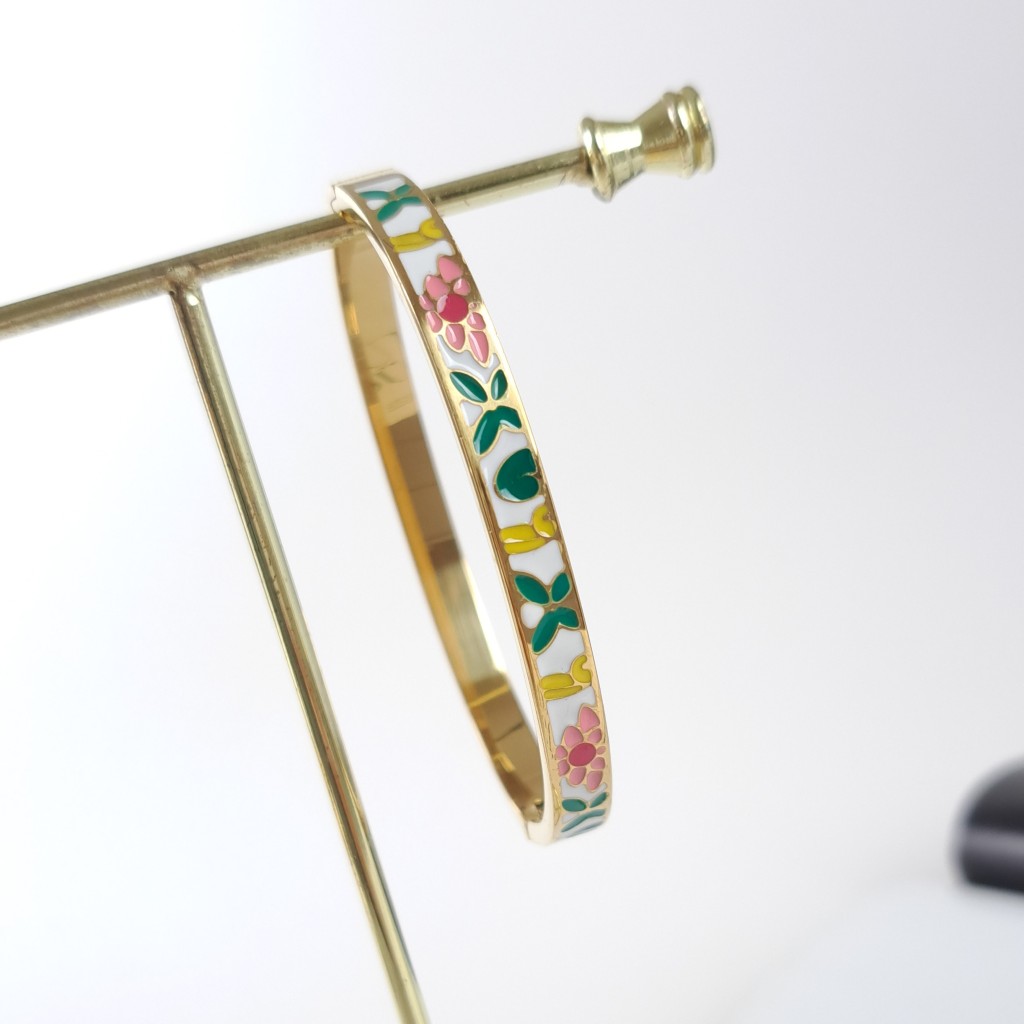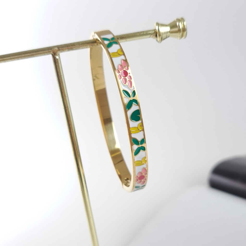 ترکیب پروانهها و گلهای ریز در میناکاری، حس لطافت، تازگی و لطیف بودن را در ظاهر دستبند تقویت میکند. رنگ صورتی پاستلی، که تمی بسیار محبوب و پرطرفدار در استایلهای ظریف و فمینین دارد، باعث میشود این مدل بهراحتی با لباسهای روشن، پاستلی و حتی رنگهای خنثی هماهنگ شود.