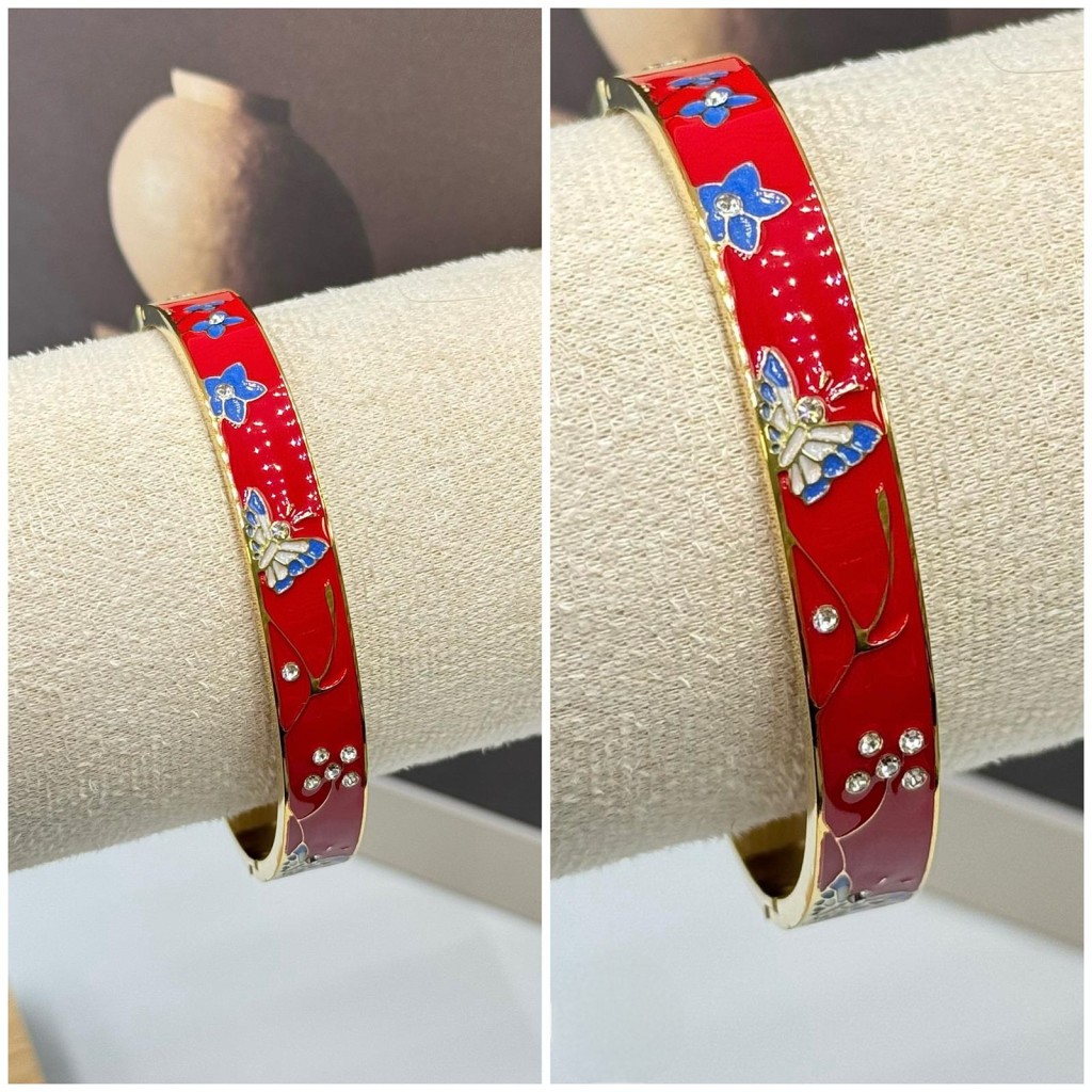 میناکاری پروانهها با ظرافت و دقتی مثالزدنی اجرا شده و هر جزئیات کوچک، حس ظرافت و هنر دستی را منتقل میکند. بالهای پروانه با خطوط و شکلهای دقیق طراحی شده و جلوهای سهبعدی به دستبند میبخشد. این ترکیب رنگ قرمز با شکل پروانه، حس حرکت و انرژی مثبت را به استایل شما اضافه میکند و باعث میشود دستبند بهتنهایی یک قطعه شاخص و قابل توجه در ظاهر شما باشد.
