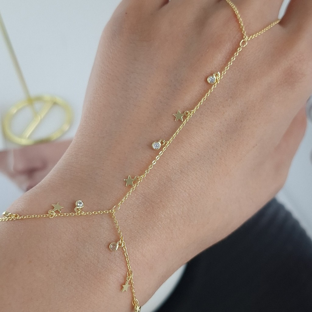 این محصول، یک دستبند تمیمه (Ring Bracelet) بسیار ظریف و شیک است که دستبند را با یک حلقه انگشتری توسط زنجیرهای نازک به هم متصل میکند. طراحی این مدل بر پایه زنجیرهای طلایی بسیار ظریف و آویزهای کوچک ستاره و نگین است که جلوهای مینیمال و رؤیایی به دست شما میدهد. اگر به دنبال خرید یک اکسسوری با ظاهری جدید، بسیار شیک و در عین حال بسیار سبک و روزانه هستید که جلوهای خاص به استایل شما بدهد، این مدل انتخابی عالی است. این دستبند حس و حالی جوانانه و مدرن دارد.