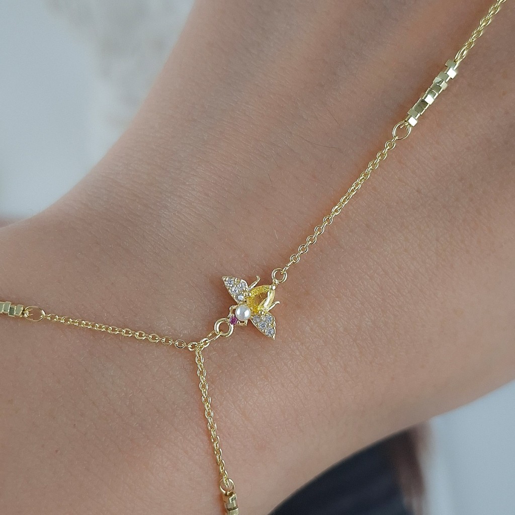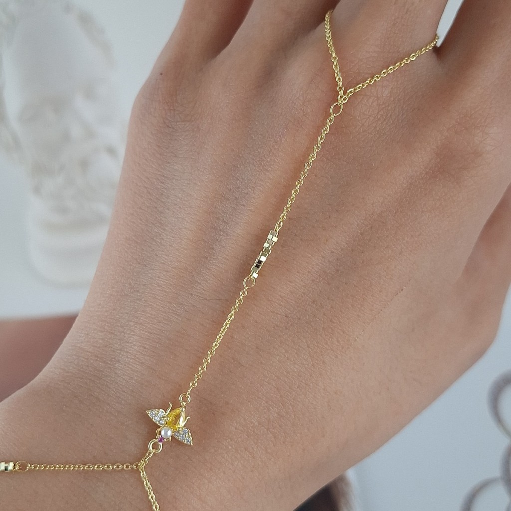 این محصول، یک دستبند تمیمه (Ring Bracelet) بسیار خاص و ظریف است که دستبند را با یک حلقه انگشتری توسط زنجیرهای نازک به هم متصل میکند. این طرح، یکی از ترندیترین و جدیدترین مدلهای اکسسوری است که در دنیای فشن طرفداران زیادی پیدا کرده است. طراحی این مدل بر پایه زنجیرهای طلایی ظریف و آویزهای کریستالی کوچک است که در نهایت به یک آویز نمادین زنبور ختم میشود. اگر به دنبال خرید یک اکسسوری با ظاهری جدید، بسیار شیک و متفاوت هستید که جلوه ویژهای به دست شما بدهد و در مجالس بدرخشید، این مدل انتخابی عالی است. این دستبند حس و حالی لوکس و در عین حال جوانانه دارد.