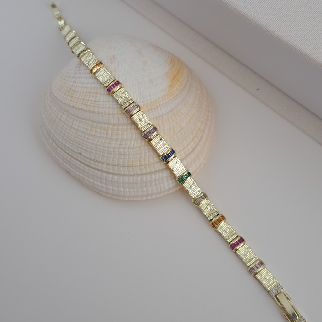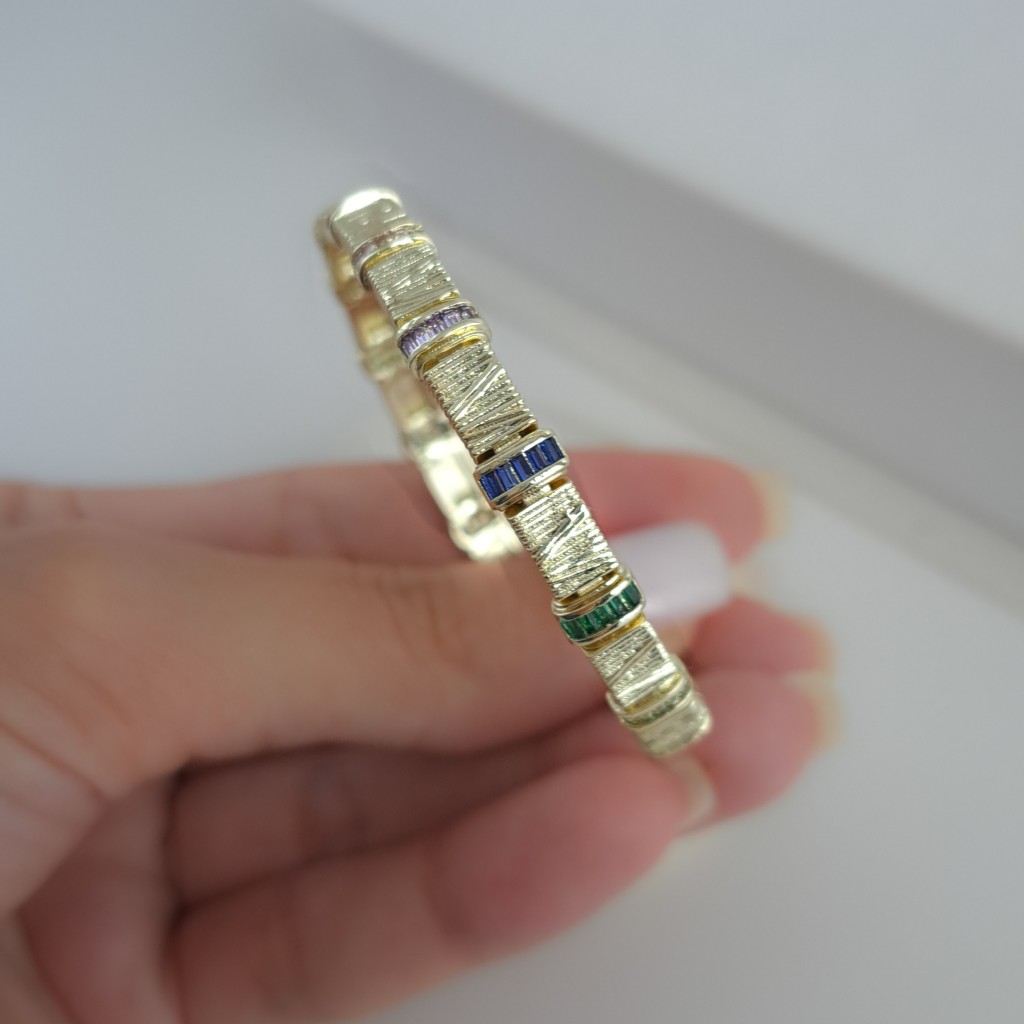 دستبند طرح طلا با نگینهای باگت رنگی از Nilay Jewelry انتخابی مدرن، رنگی و چشمنواز است. اگر به دنبال اکسسوریای هستید که جلوهای لوکس، رنگی و شاد به استایلتان ببخشد، این مدل دقیقاً همان چیزی است که نیاز دارید — ترکیبی از طراحی خاص، رنگهای زنده و کیفیت ساخت بالا.