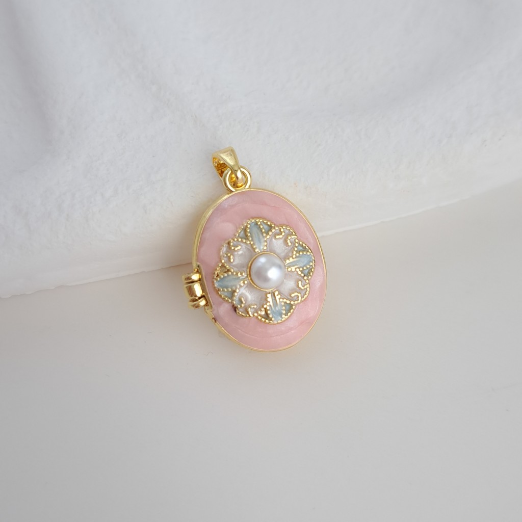 گردنبند لاکت بیضی مروارید میناکاری صورتی و سبز