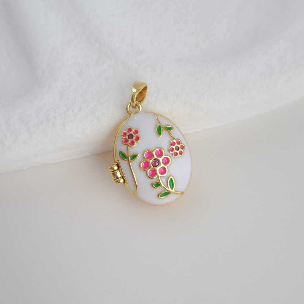 گردنبند لاکت بیضی شاخه گل میناکاری سفید*