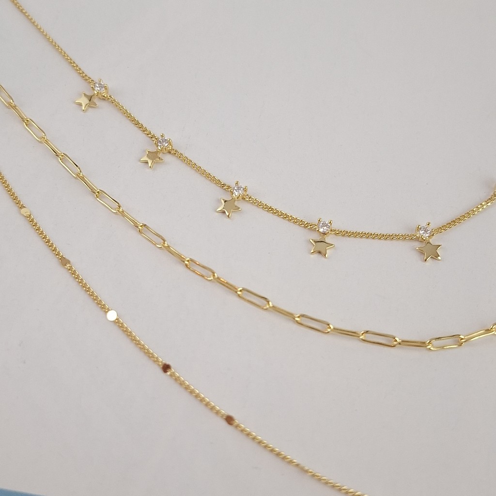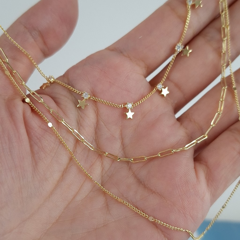 گردنبند سه ردیفه آویز ستاره و نگین | مدل لایهای درخشان و فانتزی