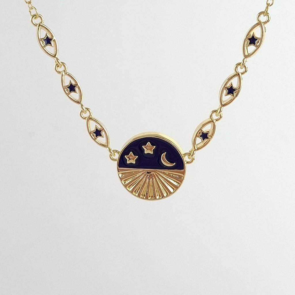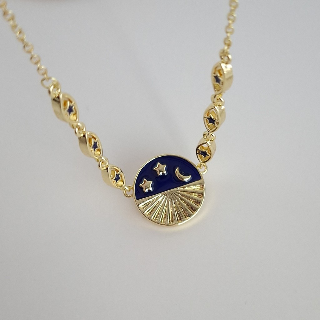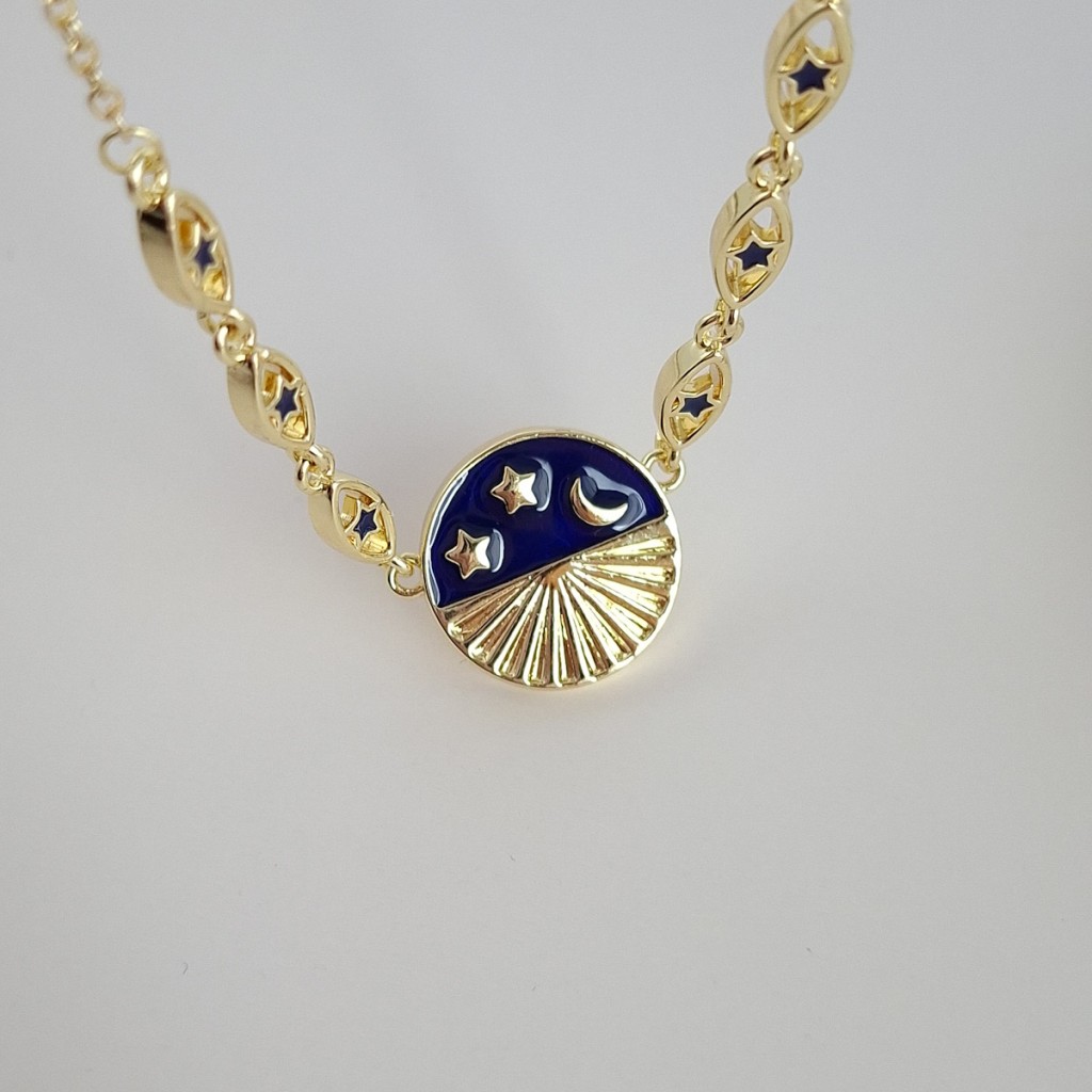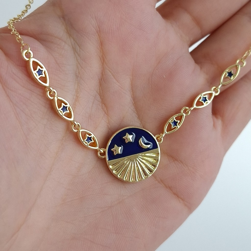 گردنبند ماه و ستاره میناکاری آبی با روکش طلا؛ طراحی ظریف و نمادین، مناسب استایلهای مینیمال، هنری و نیمهرسمی.