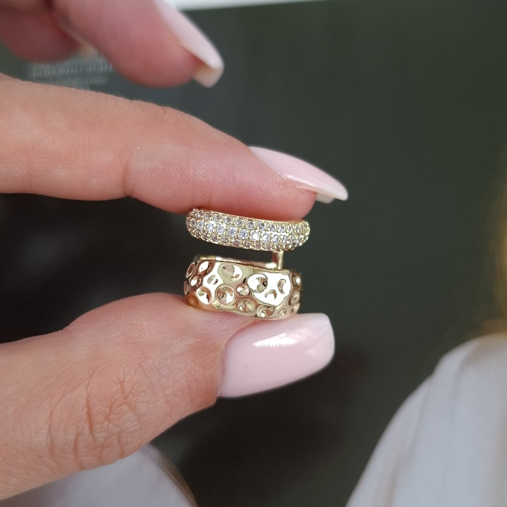 از آن اکسسوریهاییست که بیسروصدا، اما قاطع، استایل را چند پله بالا میکشد. گوشوارهای بدون نیاز به سوراخ، با طراحی دو خط موازی و پهن که با نگینهای درخشان تزئین شده؛ ترکیبی از جسارت مدرن و وقار کلاسیک. این مدل ایرکاف، دقیقاً همان جایی میایستد که مینیمالیسمِ امروزی دست در دست زرقوبرقِ اصیلِ قدیمی میگذارد.