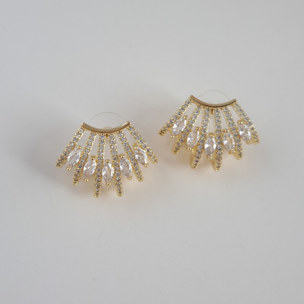 نگینهای اشکی به دقت بر روی گوشواره کار شدهاند تا در هر نوری جلوهای متفاوت و چشمنواز داشته باشند. فرم شش لاین گوشواره، حس توازن و طراحی مدرن را به مخاطب منتقل میکند و باعث میشود هر زاویهای از گوشواره جذاب و چشمگیر باشد.