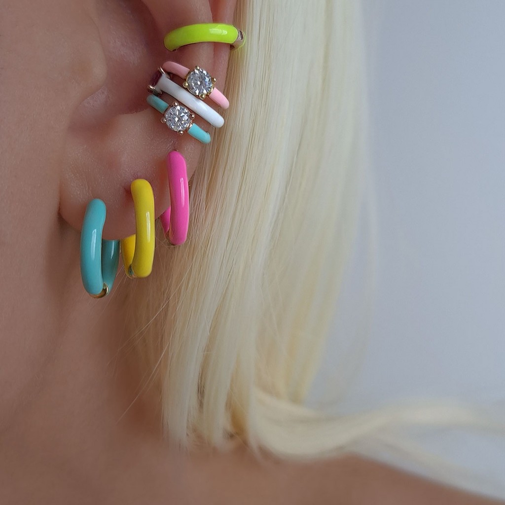 استایل کژوال (Casual): برای پوششهای روزانه، این گوشوارهها به دلیل اندازهی ظریف، انتخابی ایدهآل هستند و در کنار لباسهای با رنگهای خنثی (مانند سفید، خاکستری، سرمهای)، یک نقطه کانونی رنگی جذاب ایجاد میکنند.