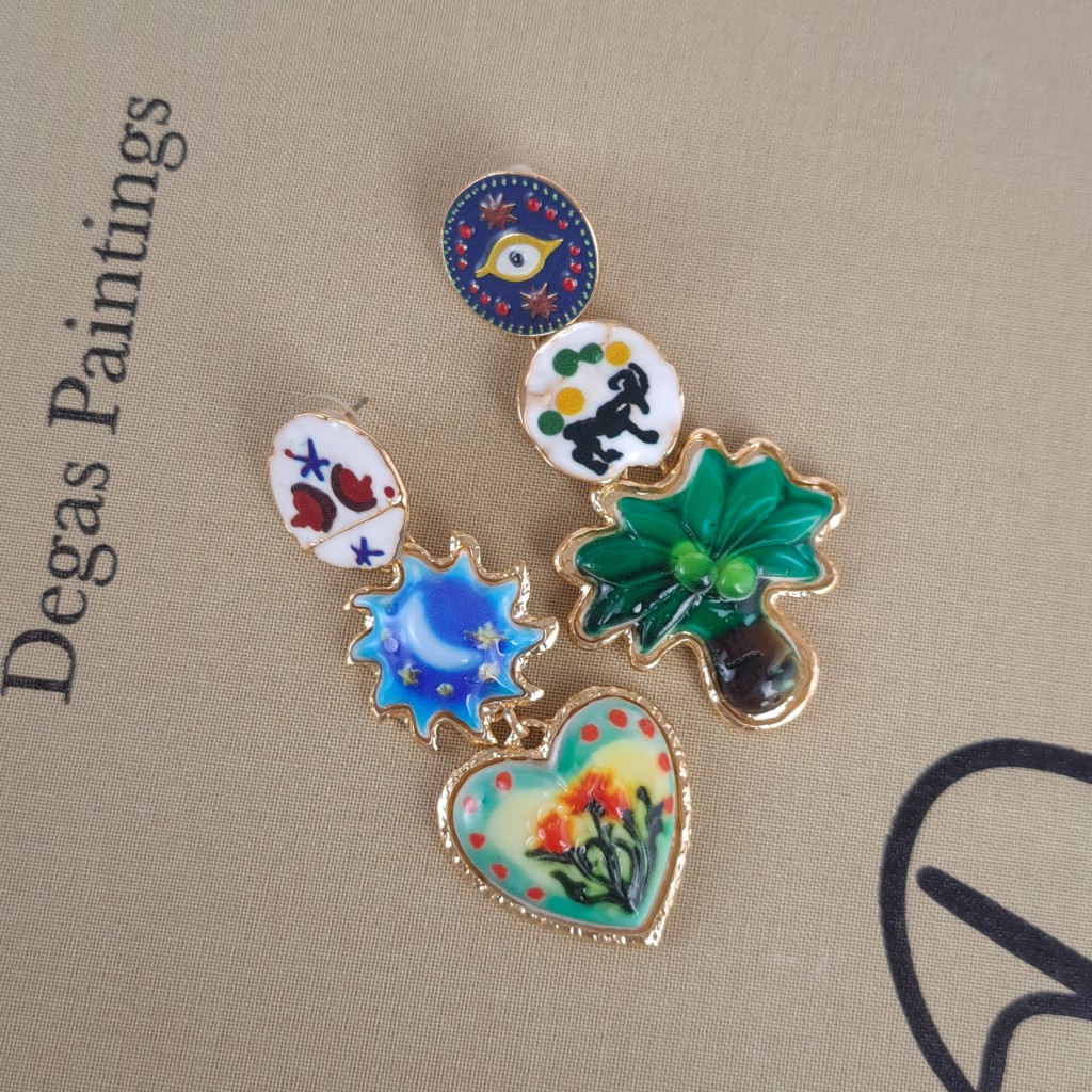 در ساخت این گوشواره از رزین و میناکاری استفاده شده است. رزین باعث میشود رنگها شفاف و جذاب باقی بمانند و حس درخشندگی طبیعی به گوشواره ببخشند. میناکاری نیز جلوهای کلاسیک و هنری به قطعه اضافه کرده و باعث میشود گوشواره در عین مدرن بودن، به سبکهای سنتی و فانتزی نیز نزدیک باشد. این ترکیب متریال باعث دوام بالا و حفظ رنگ و زیبایی گوشواره میشود.