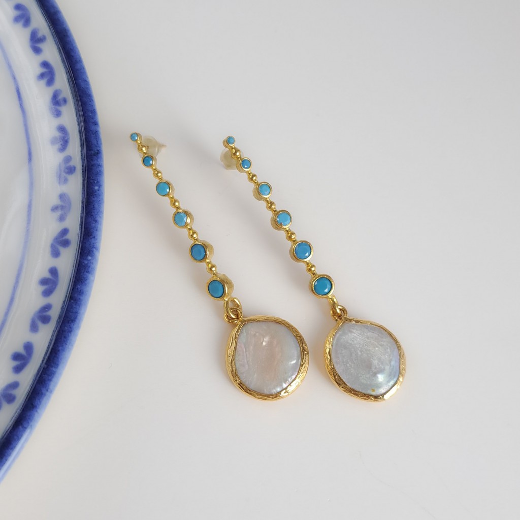گوشواره بلند نگین فیروزه و مروارید باروک طبیعی*