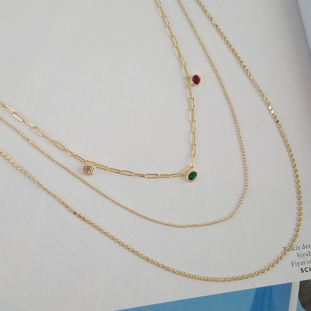 گردنبند سه ردیفه نگین رنگی با طراحی چندلایه و جلوه درخشان، انتخابی شیک برای استایل‌های فشن، مینیمال و مجلسی با ظاهری مدرن و خاص.