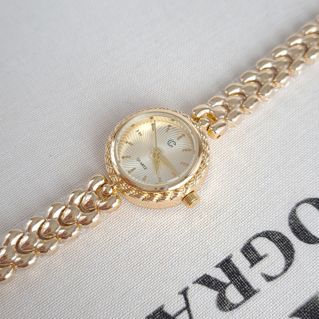 قاب دایرهای کوچک این ساعت با صفحه سفید درخشان و بند طلایی براق ترکیب شده تا حس ساعتهای لوکس و ظریف فرانسوی را زنده کند. طراحی مینیمال و تمیز صفحه، همراه با عقربههای باریک و دقیق، سادگی کلاسیک و حس آرامش ساعتهای قدیمی را منتقل میکند.