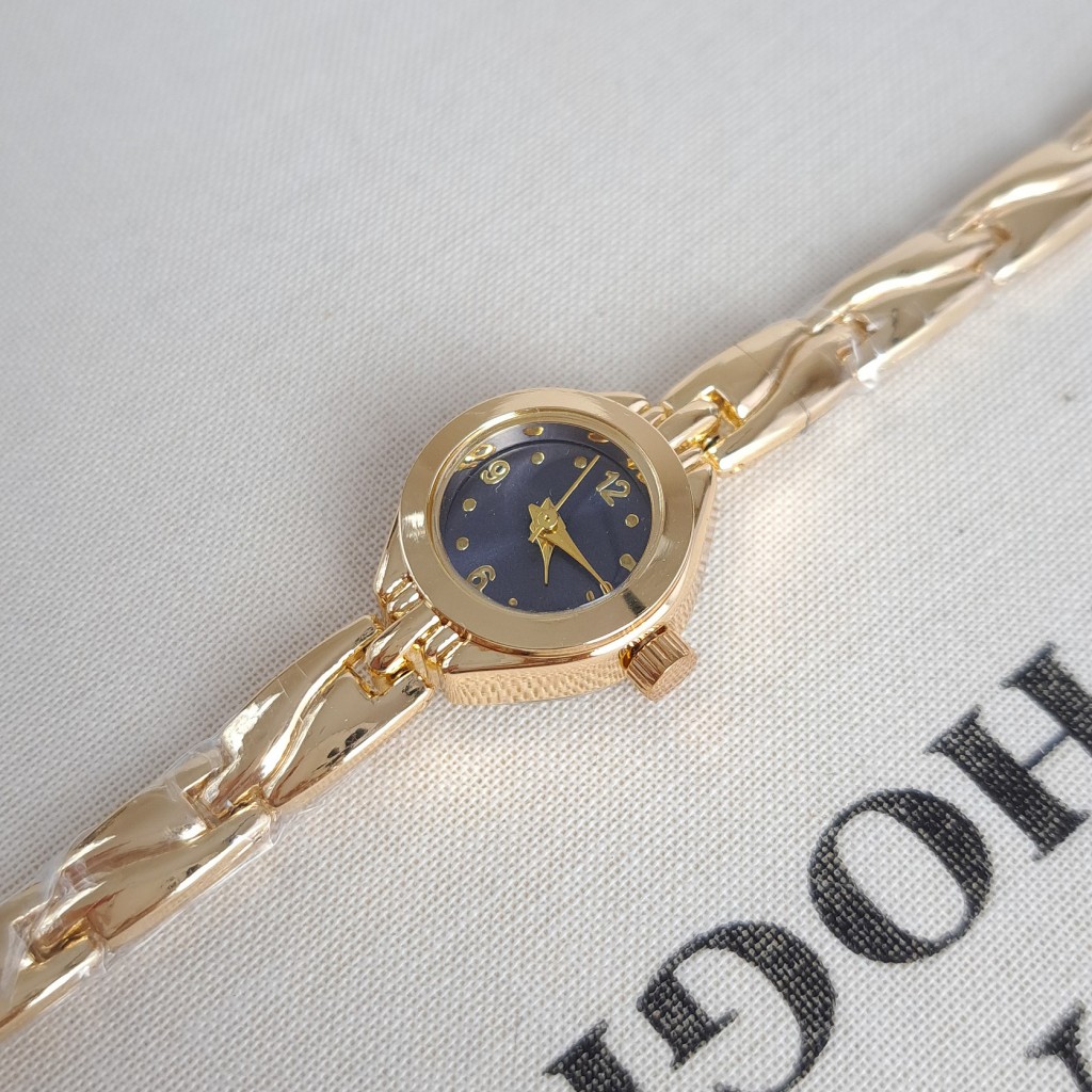 قاب دایرهای کوچک ساعت، ظاهری ظریف و زنانه به آن بخشیده و بند فلزی طلایی براق نیز قابلیت تنظیم اندازه دارد تا به راحتی متناسب با مچ دست شما قرار گیرد. ترکیب رنگ طلایی و سورمهای، حس عمق، اصالت و ظرافت را القا کرده و جلوهای لوکس و در عین حال گرم ایجاد میکند.